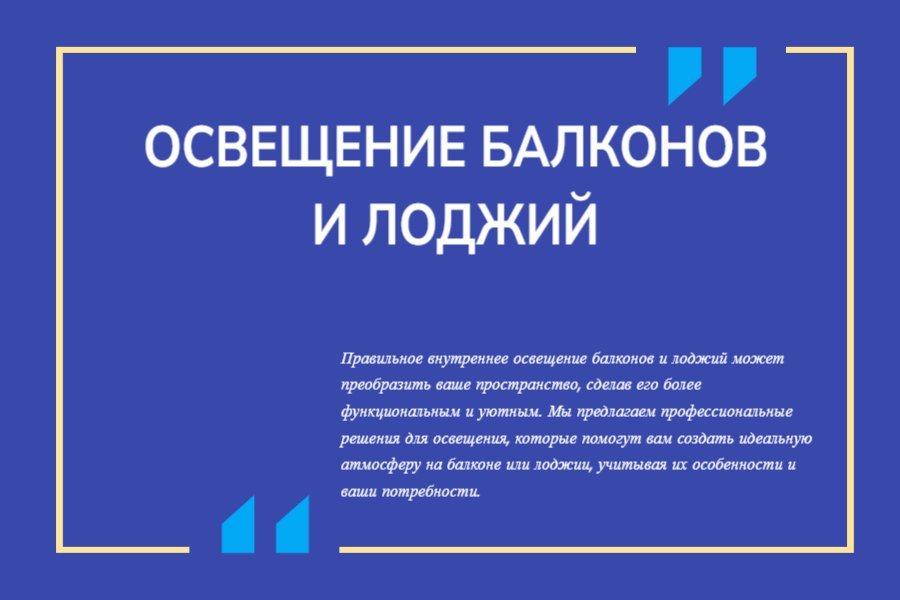 Правильное внутреннее освещение балконов и лоджий может преобразить ваше пространство, сделав его более функциональным и уютным. Мы предлагаем профессиональные решения для освещения, которые помогут вам создать идеальную атмосферу на балконе или лоджии, учитывая их особенности и ваши потребности.